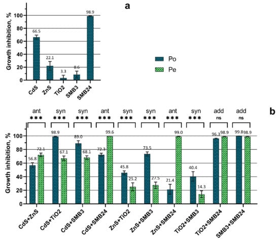 The highest antagonistic action was observed for the combination of ZnS and SMB24 (Figure 1b). Subsequently, the presence of ZnS reduced the high toxicity of SMB24, compared with the effects of single NPs (Figure 1a). The similar but not so intensive antagonistic effect was caused by the presence of CdS NPs in combination with SMB24. The lowest significant antagonistic effect among the tested combinations of NPs was demonstrated by the combination of CdS and ZnS.
