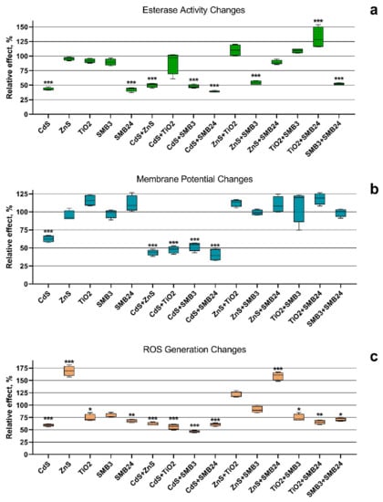 The highest esterase activity inhibition caused by a single exposure of CdS and SMB24 (Figure 2a) correlated with the highest observed toxicity of these two samples (Figure 1a). It might be expected that the normalization of esterase activity in the binary exposure of CdS and SMB24 with TiO2 should reduce the toxicity by antagonistic action. However, this assumption did not correlate with the binary toxicity data (Figure 1a). Nevertheless, the demonstrated prevention of esterase activity inhibition might facilitate faster adaptation of the cells to the toxic influence. This hypothesis required examination in further chronic toxicity studies.