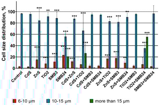 A significant decrease in cell size (an increase of the share of the smaller cells (6–10 µm)) was observed for the samples ZnS, TiO2, SMB3, and for the combinations of ZnS with all the other tested samples. These cases correlated with the lower observed toxicity, compared with the cases caused by cell enlargement.