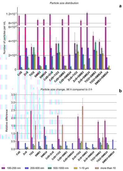 Figure 4b shows that the highest relative agglomeration after 96 h compared with the initial size distribution had the combination of TiO2 with ZnS, followed by the combination of TiO2 with CdS and the single TiO2 sample. All these cases demonstrated the same pattern, with an increase in the particles in size ranges of more than 10 µm and 100–200 nm and a simultaneous decrease in the number of particles in the size ranges between 200 nm and 10 µm.