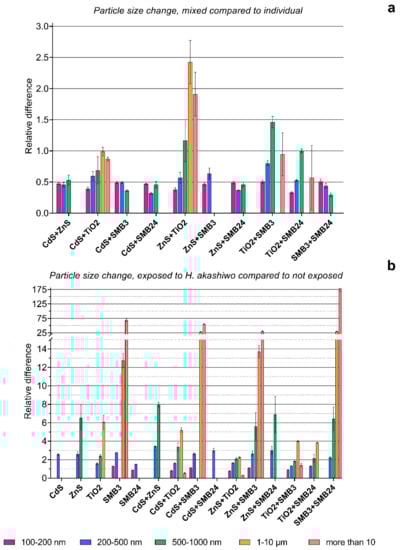 Figure 5b demonstrated that the presence of H. akashiwo had an extremely high influence on the aggregation of sample SMB3 and all the combinations of the other used samples with SMB3. The increase in the particles in the size range of 1–10 µm of 13–25 times and particles more than 10 µm of 25–175 times for these samples should be assessed, considering the very low number of such particles in the initial suspensions (Figure 4a). It means that the number of particles in the 1–10 µm and more than 10 µm size ranges did not become substantially high, but the influence of H. akashiwo cells on the agglomeration of SMB3 was obvious. The presence of the microalga highly increased the number of particles in the size range of 500–1000 nm for ZnS and all the combinations of the other NPs with ZnS. The lowest effect was observed for the samples of CdS, SMB24, and their combination. H. akashiwo had either no significant effect or slightly changed the number of 100–200 nm particles compared with the control (relative difference of 1.0) for all the used samples and their combinations.