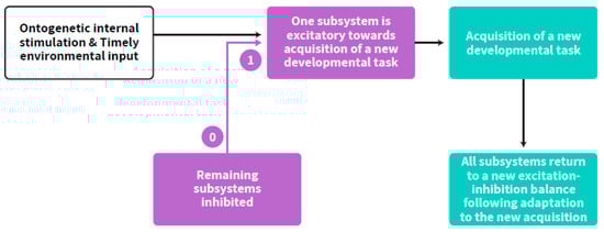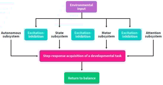 Self-regulated acquisition of a new developmental stage from embryonic to postnatal early life, involves the temporal dominance of one neurobehavioral subsystem over the others [20,21] as well as time-limited interplay between more than one age-dependent subsystem [19], and therefore may be described with the term “step-response”, adapted from Control Theory in engineering (commonly used in the field of Neural Networks). The step response of a system in a given initial state consists of the time evolution of its outputs when its inputs are the source originating the step function. In control theory, step response is the time behavior of the output of a general system when its input changes from zero to one in a very short time [29]. It implies a developmental hierarchy according to age-appropriate neurobehavioral goals. Fluidity and interconnecting influences between all subsystems are maintained during the plateau part after achieving a certain developmental goal. The step response occurs all at once within an age-appropriate range for any specific developmental goal. Accordingly, adapting the approach from neural network theories, timely step-response acquisition of a new developmental task by the child, within the excitation-inhibition axis, follows a self-regulated neurobehavioral path [18]. The optimal amount of inhibition and excitation differs by developmental stage. Thus, the balance between excitation and inhibition is the crucial factor in development. This paper suggests that this balance is the essence of the developing ANS synchrony and its coupling with the cortex, which is the basis for the self-regulation clock (Figure 3).