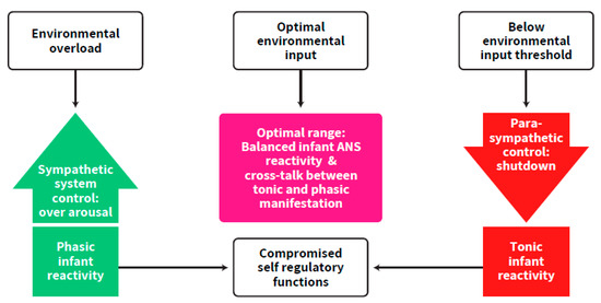 The importance of the parasympathetic system in regulating over-arousal as well as that of the sympathetic system in bringing the infant up to the arousal level needed for optimal developmental functioning have been discussed [6,9,23,24]. However, the focus on the synchrony between the two branches of the ANS as one working system aimed towards an ongoing balanced activation has not been adequately addressed. Our postulation follows a well-established concept of a required continuous balance between excitatory and inhibitory brain functions, suggesting that any deviation may put the individual at risk for adverse development [22]. Balanced activation, widely implied in the literature on the concept of self-regulation (e.g., [23,24,25], includes, according to our postulants, the balance between the two ANS branches and the excitation-inhibition balance between neurotransmitters. These types of balances are supposed to rescue the newborn from over-arousal and exhaustion as well as from systemic shutdown states [9,11,26] (Figure 2). It is emphasized here that this synchrony is a prerequisite for cortical maturation. To support this view, an author of this review, and colleagues, found that autonomic system measurements predicted Bayley mental scores in the first year of life, in term and preterm born infants [27].