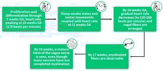 During this early stage of gestation, the heart is among the first organs to develop, undergoing proliferation and differentiation through 7 weeks GA with increasing heart rate peaking at 10 weeks GA (170 beats per minute) followed by a gradual decrease (to 120–160 beats per minute) from this peaking age onwards [33,34]. At this early time in life, vagal fibers are arranged, and by 14 weeks GA, the spiral development profile of myelination starts. By 17 weeks, myelinated fibers are observable and by 23 weeks a mature form of the vagus nerve is seen, even though many neurons have not completed myelination [35]. (Figure 4)