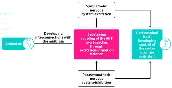 Here, a neuro-anatomical perspective for cortical-brainstem connectivity through the corticospinal tract (CST) is also presented. This developmental process is described as dependent on molecular, structural and connectivity\functional aspects of the neuronal cell, its neural network wiring and the involved fiber myelination. It is further suggested that cortical coupling with the ANS is essential for brain inhibition-excitation balance within the developing organism and that the synchrony is resulting in required molecular and biochemical delicate conditions for accomplishing the interplay between the sympathetic and parasympathetic systems.