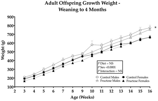3.1. Effects of Maternal Fructose Intake on Adult Offspring Growth and Weight Gain