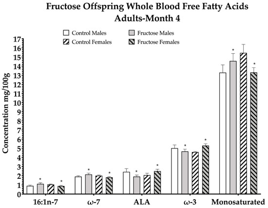 Excess maternal fructose intake was observed to have significant effects on adult offspring free fatty acid (FFA) composition (Table 2). Of the 33 whole-blood FFAs analysed, a significant dietary effect was observed in increased palmitoleic acid (p = 0.05), total omega-7 (p = 0.05), alpha-linolenic acid (ALA) (p = 0.05), total omega-3 (p = 0.04) and total monosaturated FFA (p = 0.05) levels in males and females of FD dams at 4 M (Figure 2; Table 2).