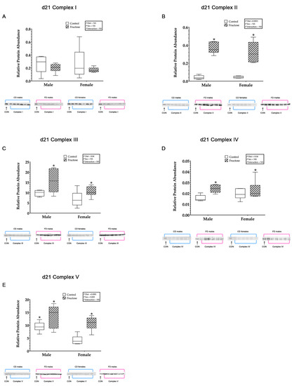 (A–D) Weanling and adult offspring hepatic mitochondrial electron transport and oxidative phosphorylation complexes I, II, III, IV and ATP synthase. Weanling offspring control males (n = 6); fructose males (n = 6); control females (n = 6) and fructose females (n = 6). (A) Represents weanling offspring hepatic mitochondrial complex-I relative protein abundance and Western blot image at D21. (B) Represents weanling offspring hepatic mitochondrial complex-II relative protein abundance and Western blot image at D21. (C) Represents weanling offspring hepatic mitochondrial complex-III relative protein abundance and Western blot image at D21. (D) Represents weanling offspring hepatic mitochondrial complex-IV relative protein abundance and Western blot image at D21. (E) Represents weanling offspring hepatic mitochondrial complex-V relative protein abundance and Western blot image at D21. All data were analysed using a 2 × 2 factorial design with diet*sex*interaction include as factors (general analysis of variance) using IBM SPSS statistics 25. Data presented as group mean ± SEM. * denotes significance of p < 0.05.