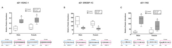 (A–C) Weanling offspring hepatic proteins. Weanling offspring control males (n = 6); fructose males (n = 6); control females (n = 6) and fructose females (n = 6). (A) Represents weanling offspring hepatic VDAC1 relative protein abundance and Western blot image at D21. (B) Represents weanling offspring hepatic SREBP-1c relative protein abundance and Western blot image at D21. (C) Represents weanling offspring hepatic FAS relative protein abundance and Western blot image at D21. All data were analysed using a 2 × 2 factorial design with diet*sex*interaction include as factors (general analysis of variance) using IBM SPSS statistics 25. Data presented as group mean ± SEM. * denotes significance of p < 0.05.