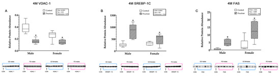 (A–C) Adult offspring hepatic proteins. Adult offspring control males (n = 6); fructose males (n = 6); control females (n = 6) and fructose females (n = 6). (A) Represents adult offspring hepatic VDAC1 relative protein abundance and Western blot image at 4 M. (B) Represents adult offspring hepatic SREBP-1c relative protein abundance and Western blot image at 4 M. (C) Represents adult offspring hepatic FAS relative protein abundance and Western blot image at 4 M. All data were analysed using a 2 × 2 factorial design with diet*sex*interaction include as factors (general analysis of variance) using IBM SPSS statistics 25. Data presented as group mean ± SEM. * denotes significance of p < 0.05.