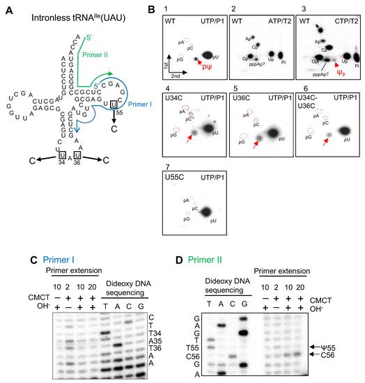 2.2. Analysis of Pseudouridine Formation in Intronless tRNAIle(UAU) by cmPus1 Candidate