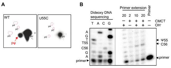 Our experimental results show that cmPus1 possesses a tRNA Ψ55 synthase activity. In yeast, Ψ55 is synthesized by Pus4. Therefore, we investigated the activity of cmPus4. As with cmPus1, wild type and the U55C mutant tRNAIle(UAU) transcripts were treated with purified cmPus4 (Figure S1B). The modified nucleotides were analyzed by 2D-TLC, and pΨ was detected in the wild type tRNA sample (Figure 3A, left panel). In contrast, pΨ formation was not observed in the U55C mutant tRNAIle(UAU) transcript (Figure 3A, right panel). This result shows that cmPus4 possesses a tRNA Ψ55 synthase activity, such as yeast Pus4. The results of primer extension confirmed this conclusion (Figure 3B).