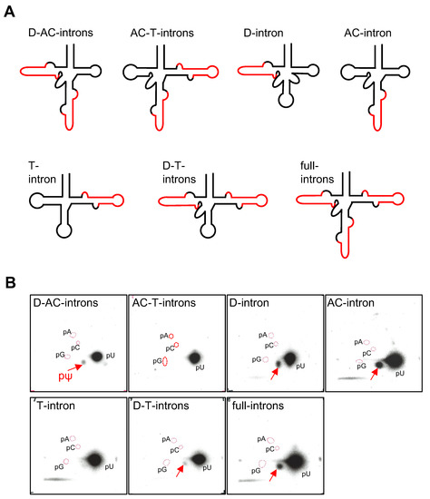 The wild type pre-tRNAIle(UAU) gene possesses three introns with bulge-helix-bulge (hBHBh’) structural motifs [25] in the D-stem (D-intron), anticodon-loop (AC-intron) and the T-loop (T-intron) (Figure 1) [23]. We prepared the seven presumptive types of pre- tRNA transcripts as shown in Figure 4A. These were tested for pseudouridylation by cmPus1. No pΨ spot was detected in the samples of the pre-tRNAs containing the AC-and T-introns (AC-T-introns) and the T-intron alone (Figure 4B). With the other five types of the pre-tRNAs [D-intron, AC-intron, D- and AC-intron (D-AC-introns), D-and T-introns (D-T-introns), and D-, AC-, and T-introns (full-introns)], Ψ modification(s) introduced by cmPus1 was detected (Figure 4B).