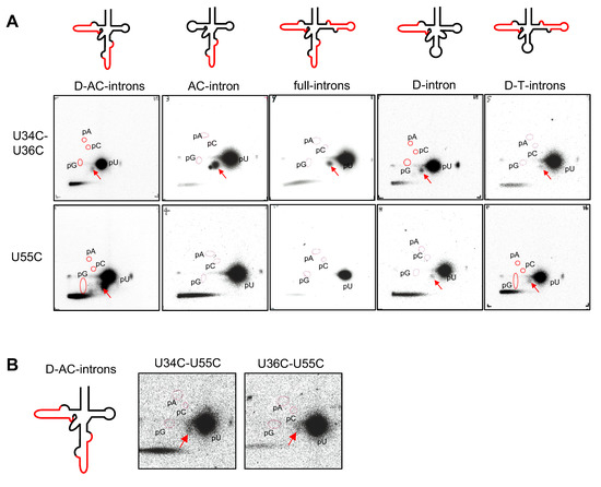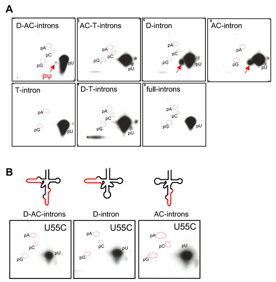 Pre-tRNAIle(UAU) containing the AC-intron or the full-introns: Ψ formation was detectable in the pre-tRNA U34C-U36C mutants (Figure 5A). However, no pΨ spots appeared with the pre-tRNA U55C mutants (Figure 5A). Thus, cmPus1 forms Ψ only at position 55 in the pre-tRNAs containing the AC-intron or the full-introns. The result of the AC-intron was in agreement with that of pre-tRNAIle(GAU) carrying the AC-intron (Figure S3).
