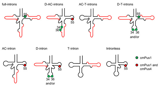 Figure 1 shows an inferred secondary structure of pre-tRNAIle(UAU) from C. merolae [23]. This pre-tRNA contains three introns in the D-arm, anticodon-loop, and T-arm. U34, U36, and U55, which would be pseudouridylated by yeast Pus1 and Pus4, are indicated in red. Pseudouridylations of U34 and U36 by Pus1 are intron-dependent, and Ψ55 synthesized by Pus4 is insensitive to the presence of an intron in yeast [3,19]. By what mechanisms do cmPus1 and cmPus4 act on the pre-tRNA species, and how does the presence or absence of the intron affect the activity of cmPus1 and cmPus4?