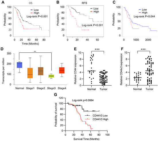 CD44 was correlated with a poor prognosis of pancreatic cancer. (A) Kaplan–Meier plots of overall survival in pancreatic cancer patients stratified according to their CD44 levels. The Kaplan–Meier plotter was used to analyze the data. (B) Kaplan–Meier plots of release-free survival in pancreatic cancer patients stratified according to their CD44 levels. The Kaplan–Meier plotter was used to analyze the data. (C) Kaplan–Meier plots of overall survival in pancreatic cancer patients stratified according to their CD44 levels. The data was analyzed in TCGA dataset from ualcan (http://ualcan.path.uab.edu, accessed on 8 May 2021). (D) CD44 levels in normal and pancreatic tumor tissues at various stages. The data was analyzed using the TCGA dataset from ualcan (http://ualcan.path.uab.edu, accessed on 8 May 2021). (E) The CD44 levels in normal and pancreatic tumor tissues were analyzed by qPCR. (F) The CD44V3 levels in normal and pancreatic tumor tissues were analyzed by qPCR. (G) Kaplan–Meier plots of overall survival in pancreatic cancer patients stratified according to their CD44V3 levels. The data are presented as mean ± S.D. ** p < 0.01; *** p < 0.001.
