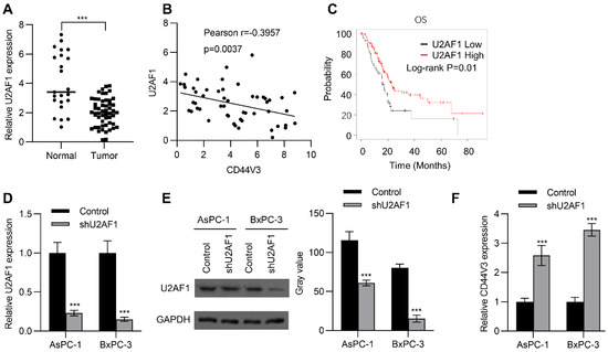 U2AF1 is an RNA splicing complex component of the spliceosome that regulates pre-mRNA splicing [27]. Recent studies have further confirmed that it can regulate alternative splicing of mRNA [28]. Therefore, we wondered whether alternative splicing of CD44V3 is regulated by U2AF1. To this end, we examined the expression of U2AF1 in adjacent normal tissues and pancreatic tumor tissues by RT-qPCR, to explore whether U2AF1 was involved in the regulation of CD44V3 expression. As shown in Figure 2A, U2AF1 levels were significantly reduced in tumors compared to those in normal tissues. Interestingly, U2AF1 expression level was negatively correlated with CD44V3 expression level in pancreatic tumor tissues (Figure 2B). Moreover, Kaplan–Meier analysis showed that higher U2AF1 levels predicted better OS for pancreatic cancer patients (Figure 2C). Since lower U2AF1 expression predicted poorer prognosis, we knocked down U2AF1 in BxPC-3 and AsPC-1 pancreatic cancer cells using shRNA, which significantly reduced both the mRNA and protein levels of U2AF1 (Figure 2D,E), and then measured the expression of CD44V3. As expected, U2AF1 knockdown could significantly increase the expression of CD44V3 in both AsPC-1 and BxPC-3 cells (Figure 2F). The above results indicated that U2AF1 regulated the splicing of CD44 and inhibited the expression of CD44V3.