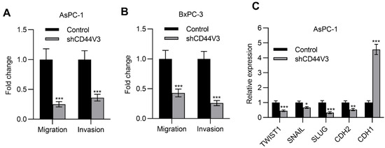 Two human pancreatic cancer cell lines, AsPC-1 (CRL-1682™) and BxPC-3 (CRL-1687™), were obtained from ATCC (Manassas, VA, USA). Cells were cultured in RPMI-1640 medium (Thermo Fisher Scientific, Waltham, MA, USA) containing 10% fetal bovine serum (Gibco, Grand Island, NY, USA), 100 μg/mL of streptomycin, 100 IU/mL of penicillin, and 2 mM L-glutamine. Cells were placed in the humidified incubator with 5% CO2 at 37 °C. Human epidermal growth factor (EGF) was purchased from Sigma-Aldrich (St. Louis, MO, USA). AsPC-1 cells with or without CD44V3 were treated by recombinant EGF (50 nmol/L) for 24 h, then transwell migration and invasion assays were performed.
