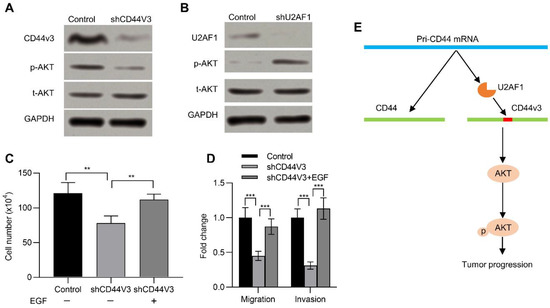 The AKT pathway is frequently activated in many kinds of human cancers and has a critical impact in neoplastic transformation [29,30]. Previous studies suggested that CD44 activated the AKT pathway [31]. We therefore wanted to determine if CD44v3 could also activate the AKT pathway. To this end, we examined its activation in pancreatic cancer cells with or without CD44V3. Knockdown of CD44V3 reduced the p-AKT level in AsPC-1 cells compared to that of control (Figure 6A). On the contrary, knockdown of U2AF1, which promoted the expression of CD44V3, could significantly increase the expression of p-AKT (Figure 6B). In addition, EGF, which activates the AKT signaling pathway and enhances tumor growth, invasion, and metastasis [32], recovered the CD44V3 knockdown-inhibited cell viability (Figure 6C). Moreover, EGF treatment could rescue the invasion and migration ability of pancreatic cancer cells, which was inhibited in CD44V3 knockdown pancreatic cancer cells (Figure 6D). Taken together, U2AF1 mediated the splicing of CD44V3. The upregulation of CD44V3 could activate the AKT signaling pathway, which eventually promoted pancreatic tumor progression (Figure 6E).