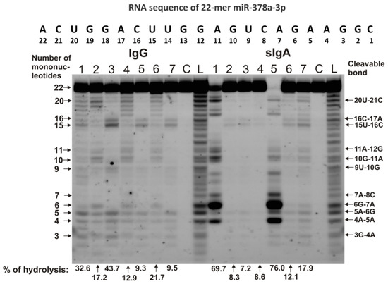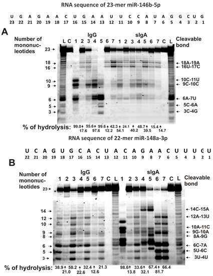 The relative activities in the hydrolyses of five microRNAs were analyzed using seven IgG and sIgA preparations that were isolated from milk plasma, as described in [73,74]. Typical patterns of the splitting of miR-146b-5p and miR-148a-3p by seven milk sIgAs and IgGs are shown in Figure 1. Three out of seven IgG preparations weakly hydrolyzed miR-146b-5p (Figure 1A). The major cleavage sites of miR-146b-5p in the case of IgGs, with numbers 3 and 4, are 10C-11U, 9C-10C, and 6A-7U, while other IgGs more weakly cleaved this miRNA in these sites (Figure 1A). Interestingly, four out of seven IgG preparations (especially with number 7) effectively hydrolyzed miR-146b-5p at the 18A-19A and 16U-17C sites. Exactly, these 18A-19A and 16U-17C sites of hydrolysis were found to be the most typical and common for all seven sIgA preparations (Figure 1A). The characteristic sites for IgGs in the case of sIgAs should be attributed to moderate hydrolysis sites.