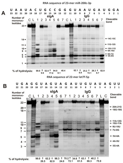 Interestingly, the hydrolyses of miR-148a-3p and miR-200c-3p by sIgAs, on average, were 1.7–1.9 times more active than by IgGs (Table 3).