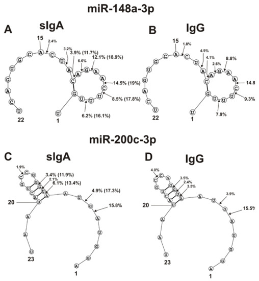 Four of the six hydrolysis sites of miR-200c-3p are also located in the loop of this RNA, but they can be classified as moderate cleavage sites in the case of IgGs (Figure 4D). Several sIgA preparations more efficiently hydrolyzed miR-200c-3p at two sites in this loop (Figure 4C). The most efficient hydrolysis of this miR-200c-3p by sIgAs and IgGs occurred at the 5A-6D site outlying from the loop (Figure 4C,D).