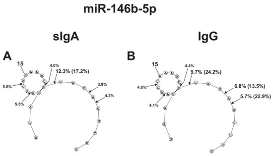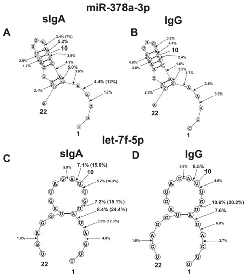 Of the six sites of pronounced hydrolysis, three are also located in a specific loop of miR-146b-5p. Some sIgA preparations hydrolyzed these microRNAs at two sites (7U-8G and 10U-11A) more efficiently than at other ones (Figure 5D). However, one sIgA preparation hydrolyzed this microRNA most efficiently at the 5U-6A site (24.4%). At the same time, the overall sites of maximum hydrolysis of let-7f-5p by sIgAs and IgGs were entirely different: 5U-6A and 7U-8G (Figure 5C,D).