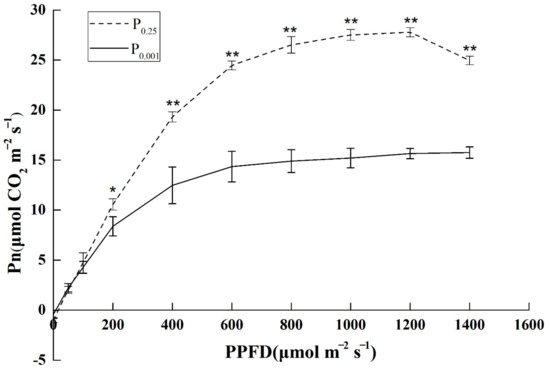 The seedling photosynthetic light–response curves under the different Pi treatments. Pn: net photosynthesis rate; PPFD: photosynthetic photon flux density. The error bars indicate the standard deviation (SD; n = 4). The asterisks indicate the significant differences according to Tukey’s test using a one-way ANOVA (* p < 0.05; ** p < 0.01).