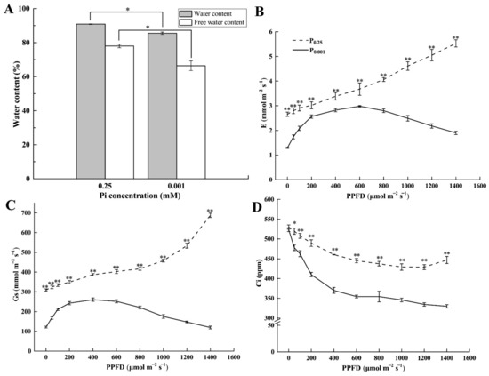 Leaf water content, free water content (A); E: transpiration rate (B); Gs: stomatal conductance (C); and Ci: intercellular CO2 concentrations (D) under the different Pi treatments. The error bars indicate SD (n = 4). The asterisks indicate the significant differences according to Tukey’s test using one-way ANOVA (* p < 0.05; ** p < 0.01).