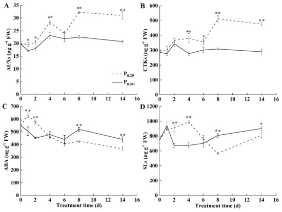 Changes in the endogenous hormone contents (A) AUX, (B) CTK, (C) ABA, and (D) SL in melon leaves. The error bars indicate SD (n = 4). The asterisks indicate the significant differences according to Tukey’s test using a one-way ANOVA (* p < 0.05; ** p < 0.01).