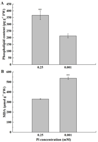 Phospholipid contents (A) and MDA contents (B) in the first true leaf under the different Pi treatments. The error bars indicate SD (n = 4). The asterisks indicate the significant differences according to Tukey’s test using a one-way ANOVA (** p < 0.01).