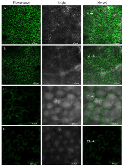 Confocal analysis was performed as described previously [50]. The chlorophyll autofluorescence was observed with an excitation wavelength of 480 nm using a confocal microscope (Leica Microsystems, Wetzlar, Germany).
