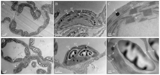 Representative electron micrographs of chloroplasts taken from the intact leaves of P0.25 (A–C) and P0.001 (D–F). CW, cell wall; GT, grana thylakoid; ST, stroma thylakoid; SG, starch granule; P, plastoglobuli. The scales for the mesophyll cells (A,D), the chloroplast (B,E), and the enlarged parts (C,F) are 2 μm, 1 μm, and 200 nm, respectively.