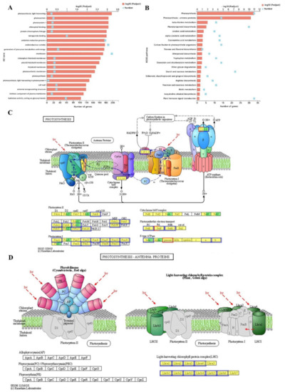 GO and KEGG functional enrichment analysis under low-Pi stress. (A) Top 20 GO terms of DEG enrichment under low-Pi stress. (B) Top 20 KEGG pathways of DEG enrichment under LP stress. (C) Schematic diagram of photosynthesis KEGG pathway. The yellow and green backgrounds indicate the known and new genes, respectively. The red and blue borders indicate the up- and downregulated genes, respectively. (D) Schematic diagram of photosynthesis-antenna proteins KEGG pathway. The yellow backgrounds indicate the known genes. The blue borders indicate the downregulated genes.