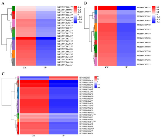 The clustering heatmap of DEGs based on the log10 (fold change) values showed that the DEGs on chloroplast thylakoid membrane and photosynthesis light harvesting were downregulated by low-Pi stress (Figure 8A,B). The DEGs enriched in photosynthesis were downregulated by low-Pi stress, with the exception of MELO3C19895 and MELO3C025376 (Figure 8C). The downregulated genes caused the functional disturbance of thylakoid membrane proteins, the light-harvesting complex, and photosynthetic chain proteins. Low-Pi stress played a negative role in the transcriptional regulation of genes on photosynthesis. It provided evidence of photosynthesis inhibition by low-Pi stress at the transcriptome level.