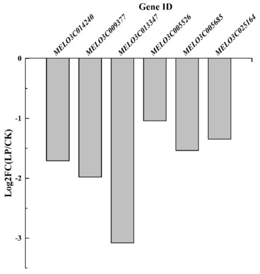 The aquaporin genes, MELO3C014240, MELO3C009377, MELO3C013347, MELO3C005526, MELO3C005685, and MELO3C025164 were downregulated by P0.001 on the 14th day of LP treatment (Figure 9). Low-Pi stress caused transcriptional downregulation of aquaporin genes in melon leaves. It was detrimental to H2O and CO2 exchange among mesophyll cells and chloroplasts.