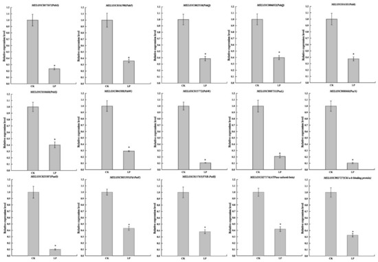 The qRT-PCR analysis was employed to validate the expression profiles of DEGs with 14 genes on the photosynthesis pathway and one gene on light harvesting (Figure 10). The relative expression level of all 15 genes was significantly lower than CK, which was characterized by a similar trend of transcript level. In conclusion, although the expression values were, in most cases, different from RNA-Seq in qRT-PCR, the obtained data confirmed the reliability of the results generated by RNA-Seq analysis.