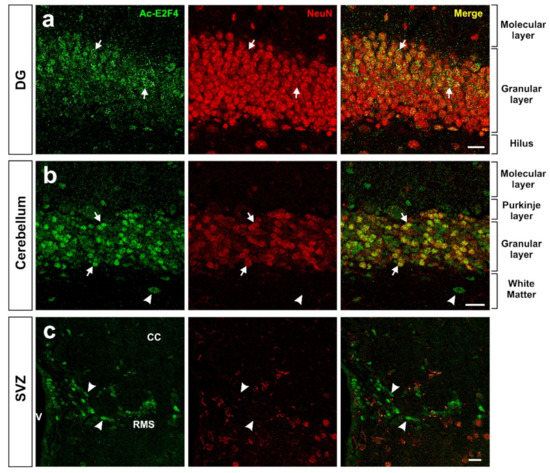 Figure 2. Expression pattern of acetylated E2F4 in the dentate gyrus (DG) (a), cerebellum (b), and subventricular zone (SVZ) (c) of 2.5-month-old WT mice. One single confocal plane showing co-immunostaining with anti-acetylated E2F4 (Ac-E2F4) and anti-NeuN (NeuN) antibodies in sections from the indicated brain areas. NeuN specifically labels neurons. Ac-E2F4 immunostaining in NeuN-positive (arrows) and NeuN-negative (arrowheads) cells is shown. V: ventricle; CC: corpus callosum; RMS: rostral migratory stream. Scale bar: 20 μm.