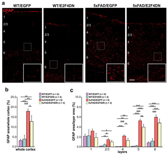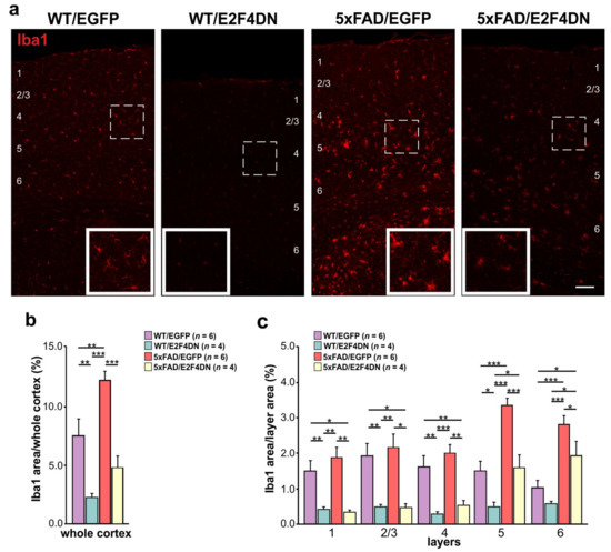 To verify whether microgliosis is reduced at 1 year of age in 5xFAD/E2F4DN mice compared with 5xFAD/EGFP mice, we crossed 5xFAD mice with either E2F4DN or control EGFP mice. Then, cortical sections of 1 year-old WT/EGFP, WT/E2F4DN, 5xFAD/EGFP and 5xFAD/E2F4DN mice were immunolabeled with Iba1, a specific microglia marker [186]. This analysis indicated that, as expected, the area occupied by microglia in the cerebral cortex of 5xFAD/EGFP mice was significantly greater than that of WT/EGFP mice (Figure 3a,b). This increase was associated with cortical layers 5–6 (Figure 3c). Therefore, as occurs at earlier time points [12], microglial cells are also activated in the cerebral cortex of 5xFAD/EGFP mice of 1 year of age.