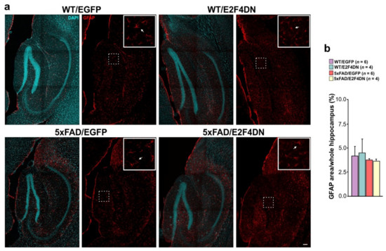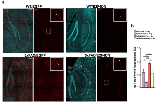 Figure 4. Attenuation of microgliosis by E2F4DN in the hippocampus of 1-year-old 5xFAD mice. (a) Iba1 immunostaining (arrow) in the hippocampus of mice with the indicated genotypes. Inserts show the high magnifications of the indicated dashed boxes. DAPI counterstaining was included to identify the hippocampus structure. (b) Percentage of the area occupied by Iba1 immunostaining in the hippocampus. * p < 0.05; ** p < 0.01; *** p < 0.001 (one-way ANOVA, followed by post hoc Newman-Keuls). Scale bar: 100 μm.