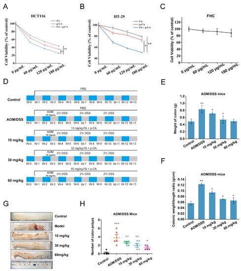 2.1. FA + p-CA Inhibit the Growth of Colorectal Cancer in CRC Cells and AOM/DSS CRC Mice