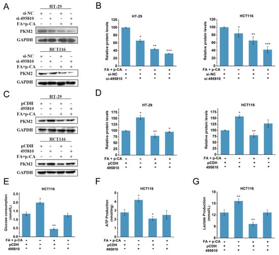 2.5. LncRNA 495810/PKM2 Axis Is Involved in the Inhibition Effect of FA + p-CA on the Aerobic Glycolysis