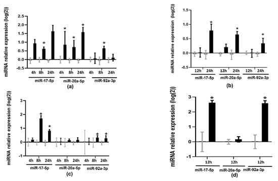Effects of TMAO on the expression of miR-17-5p, miR-20a-5p, and miR-92a: (a) HEPG-2 cells, (b) THP-1 cells, (c) murine liver organoids, and (d) human primary macrophages were treated with 6 µM of TMAO at specified timepoints; miR-17-5p, miR-20a-5p, and miR-92a-3p levels were measured by RT-qPCR. mRNA levels were calculated with the 2−ΔΔCT method and Log2-transformed. The mean ± SEM of three independent experiments is shown. Expression values in TMAO-incubated samples (black bars) were compared with corresponding control samples (grey bars) at each timepoint using Student’s t-test; * p < 0.05.