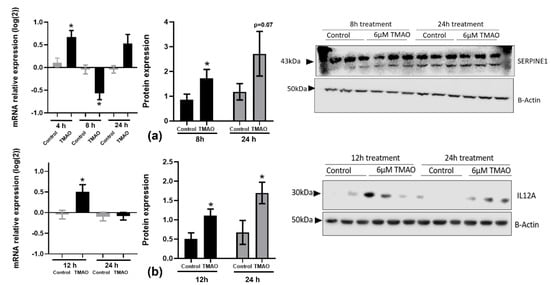 We observed a significant increase in IL-12A gene expression levels in THP-1 cells incubated with 6 µM of TMAO for 12 h (0.50 ± 0.17), whereas protein levels were significantly increased at the 12 h (1.11 ± 0.16) and 24 h (1.70 ± 0.27) timepoints (Figure 2b).