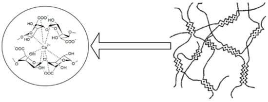 Formation of the three-dimensional network of the “egg box” type by the reticulating sodium alginate with Ca2+ ions (scheme made with the Biorender program).