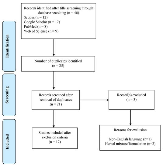 A total of 46 studies were identified from title screening in different databases (Scopus: n = 12; Google Scholar: n = 17; PubMed: n = 8; and Web of Science: n = 9). The number of duplicated articles from these databases was 25 and, after removal of duplicates, 21 articles were obtained. Based on the inclusion and exclusion criteria, 3 studies were excluded (see reasons for exclusion in Figure 1) and 17 articles were included in the study. The studies were published between 2008 and 2021.