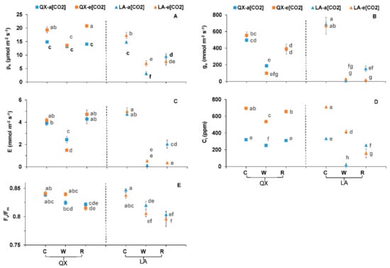 Waterlogging significantly decreased the Pn of ‘QX’ at e[CO2] from 19.3 ± 1.11 to 13.2 ± 0.17 μmol m−2 s−1 (Figure 1A). By comparison, the decreased Pn of ‘LA’ regardless of [CO2] was induced by waterlogging rather than respective controls (Figure 1A). The Pn of ‘QX’ at e[CO2] was fully recovered at recovery stage to 20.8 ± 0.34 μmol m−2 s−1, while that of ‘LA’ was not with a low value of 7.7 ± 1.41 μmol m−2 s−1 (Figure 1A). The trends of gs and E were similar with that of Pn in plants at control, waterlogging and recovery (Figure 1B,C). The gs and E of both genotypes during waterlogging were significantly lower than control regardless of [CO2], while only that of ‘LA’ did not fully recover (Figure 1B,C). The Ci of the two genotypes at waterlogging (251 ± 8.8 and 537 ± 8.2 ppm at a[CO2] and e[CO2]) were lower than the control (321 ± 0.8 and 695 ± 5.6 ppm at a[CO2] and e[CO2]) (Figure 1D). Only the Ci of ‘QX’ fully recovered to 310 ± 2.5 and 656 ± 17.5 ppm at a[CO2] and e[CO2] (Figure 1D). Moreover, the e[CO2] significantly increased the Pn of ‘QX’ and ‘LA’ at control (19.3 ± 1.11 and 17.3 ± 1.14 μmol m−2 s−1), the Pn of ‘QX’ at recovery stage (20.8 ± 0.34 μmol m−2 s−1) and the Pn of ‘LA’ at waterlogging (6.9 ± 0.99 μmol m−2 s−1) as compared with respective controls at a[CO2] (Figure 1A). The e[CO2] significantly increased the Ci except for the ‘LA’ during recovery (Figure 1D). Four gas exchange parameters were affected by individual genotype and water condition as well as genotype × water, while only Pn and Ci were affected by [CO2] (Table 1). The genotype × [CO2] had an effect on Pn and Ci, where a three-way interaction affected Pn, E and Ci (Table 1). The genotype, water, genotype × [CO2] and genotype × water showed effects on Fv/Fm (maximum potential quantum efficiency of photosystem II or PSII) (Table 1).