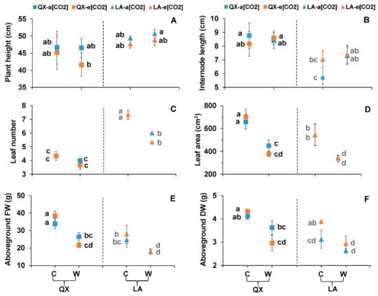 (A) Plant height, (B) internode length, (C) leaf number, (D) leaf area, (E) aboveground fresh weight (aboveground FW) and (F) aboveground dry weight (aboveground DW) of the two tomato genotypes (‘QX’, S. lycopersicum and ‘LA’, S. pimpinellifolium) after the first-round treatments. The treatments, data analysis and presentation are the same as Figure 1, except the treatments lasted five days.
