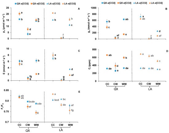 (A) Net photosynthetic rate (Pn), (B) stomatal conductance (gs), (C) transpiration rate (E), (D) intracellular CO2 concentration (Ci) and (E) maximum quantum efficiency of photo system II (Fv/Fm) of the first fully expanded leaf from the two tomato genotypes (‘QX’, S. lycopersicum and ‘LA’, S. pimpinellifolium) after the second-round treatments for four days. The a[CO2] and e[CO2] indicated 400 and 800 ppm CO2 concentration, respectively. The ‘CC’, ‘CW’ and ‘WW’ followed by a[CO2] or e[CO2] indicated that the plants were at (1) control condition for both rounds; (2) control followed by waterlogging condition; and (3) waterlogging condition for both rounds, respectively. The data indicated average values ± SE (n = 3). The ANOVA was performed within all the treatments of two genotypes. Different small letters indicated significant differences (p < 0.05).