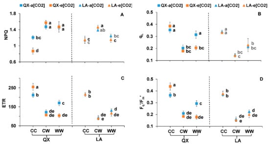 The NPQ of ‘QX’ at CW and WW and ‘LA’ at CW was significantly higher than respective control, regardless of [CO2] (Figure 4A). The qL, ETR and Fq’/Fm’ in both genotypes at CW and WW significantly decreased as compared with control regardless of [CO2], except for the qL of ‘QX’ at a[CO2]-WW (Figure 4B–D). The genotype and waterlogging had significant effects on the NPQ, qL, ETR and Fq’/Fm’ with the interaction of genotype and water on NPQ, [CO2] and water on ETR and Fq’/Fm’ (Table 2).